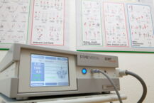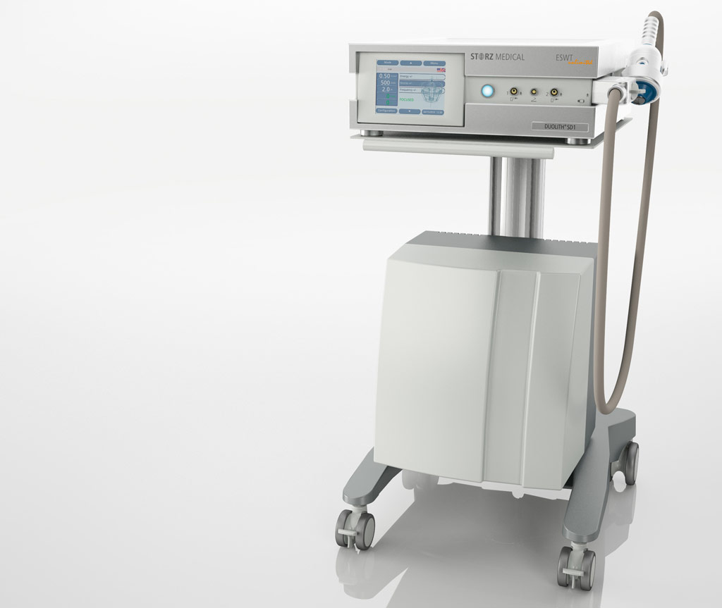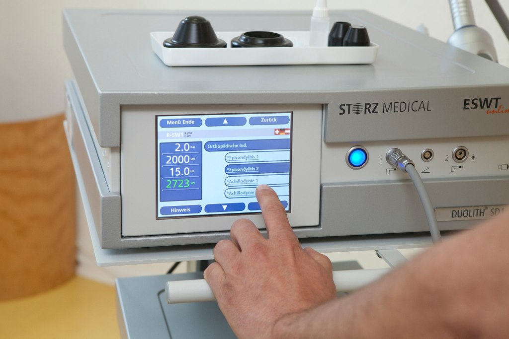Ich setze in meiner Praxis das Gerät „Duolith SD 1-Table Top“ von STORZ Medical ein, mit dem sowohl fokussiert als auch radial behandelt werden kann. Bei diesem ESWT-Gerät ist der Energiebereich sehr gut abstufbar. Tiefe Behandlungszonen sind hierbei sicher therapierbar, durch die grosse Fokuszone ist eine sehr hohe Treffsicherheit gewährleistet.
