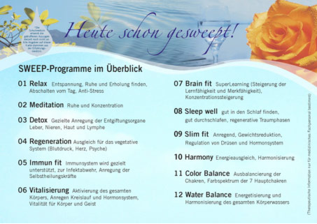 Mithilfe der eigenen Schwingung als „Trägerwelle“ können gezielte therapeutische Schwingungsprogramme, die Resonanzfelder der SWEEP-Programme als „add ons“ auf den Anwender übertragen werden. Sie sind eine Zusammenstellung von ausgewählten Schwingungsmustern, die auf Basis des Wissens der Frequenztherapie, Biologie und Quantenphysik zusammengestellt wurden und bestimmte Zielrichtungen bei ihren Effekten im Körper aufweisen.